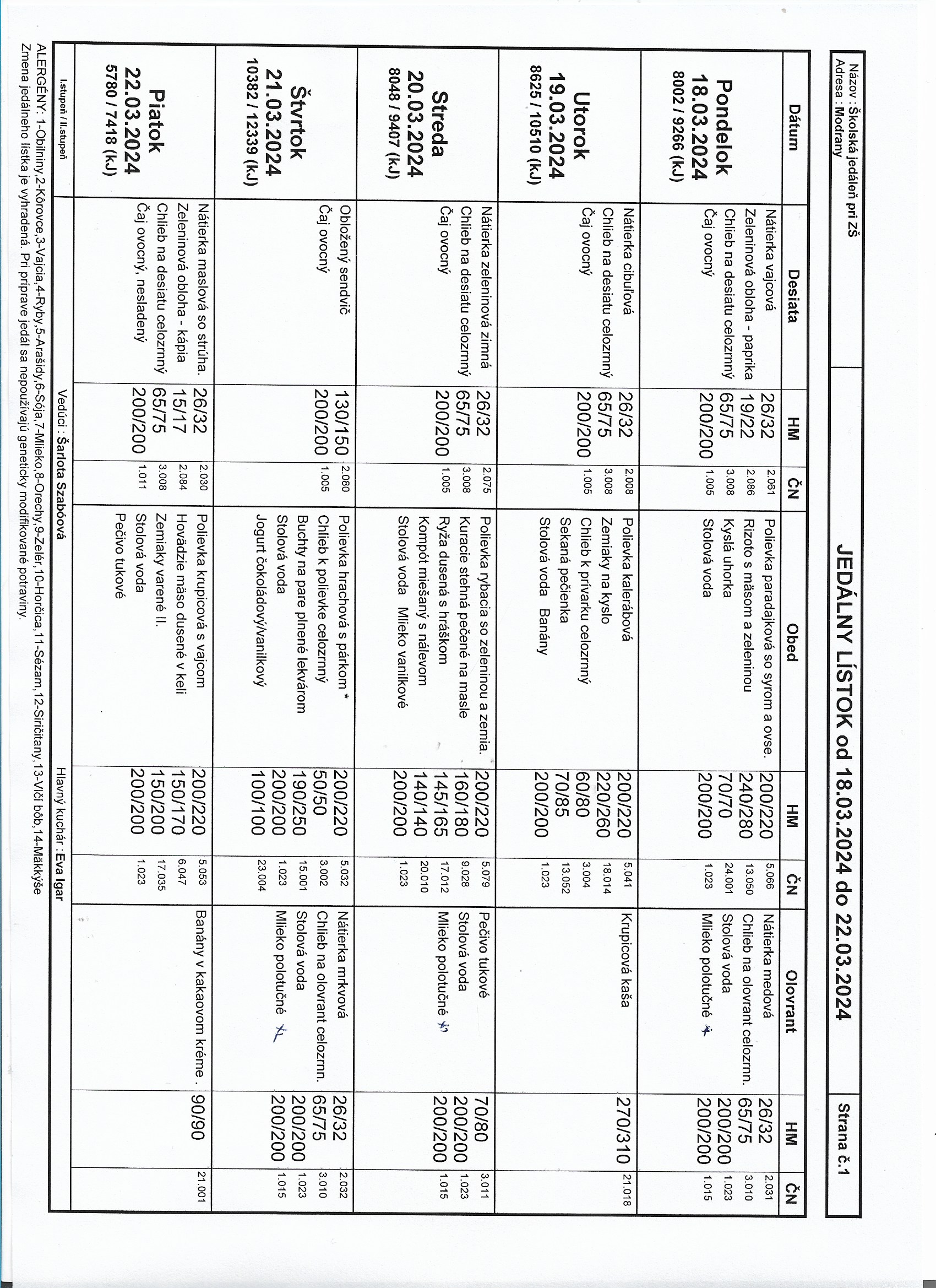 Jedálny lístok od 11.3.2024 do 15.03.2024